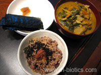 おにぎりに用いているご飯は、小豆入り玄米ご飯です。汁物(ゴボウ汁や味噌汁)の「一杯」は、深いお椀によそうので、かなり多いです(350gぐらい)。