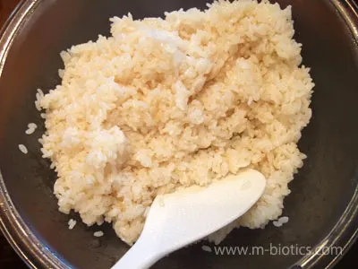 炊きあがったら昆布を取り除き、飯をボウルなど別容器に移し、梅酢と水を混ぜたものを入れ、しゃもじで飯を切るようによく混ぜて冷ます。(以下の写真では昆布は取り除かずそのままにしてある)