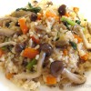 - 鍋にごま油をひいて温め、生姜とごぼうを入れてさっと炒めたらきのこ類を加える。きのこから水分が出てカサが減ってくるまで炒めたら、油揚げを入れて全体を軽く炒め合わせる。